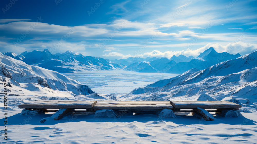 Snowy mountain landscape featuring a wooden bench overlooking majestic peaks under a clear blue sky during winter #1758141632
