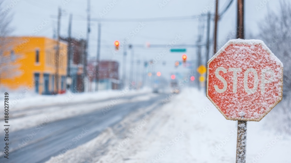 Snowy street with a stop sign in a city area during a winter day #1880277819