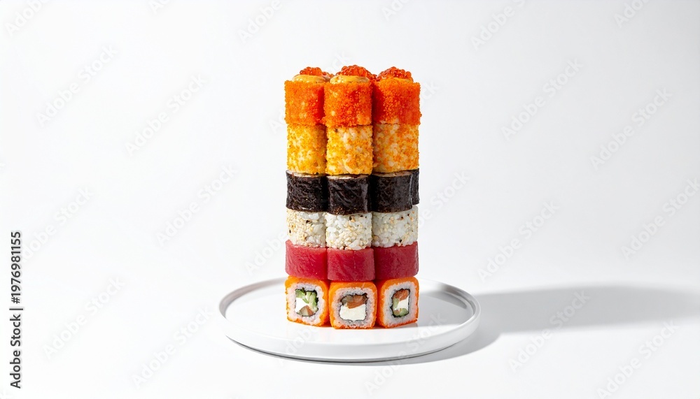 寿司タワー・軍艦巻き・いくら・うに・SNS映え・フォトジェニック・カラフル・インスタ映え和食/Sushi tower with gunkan maki, ikura uni tobiko colorful stack, Instagram food photography, photogenic Japanese food, eye-catching sushi arrangement #1976981155