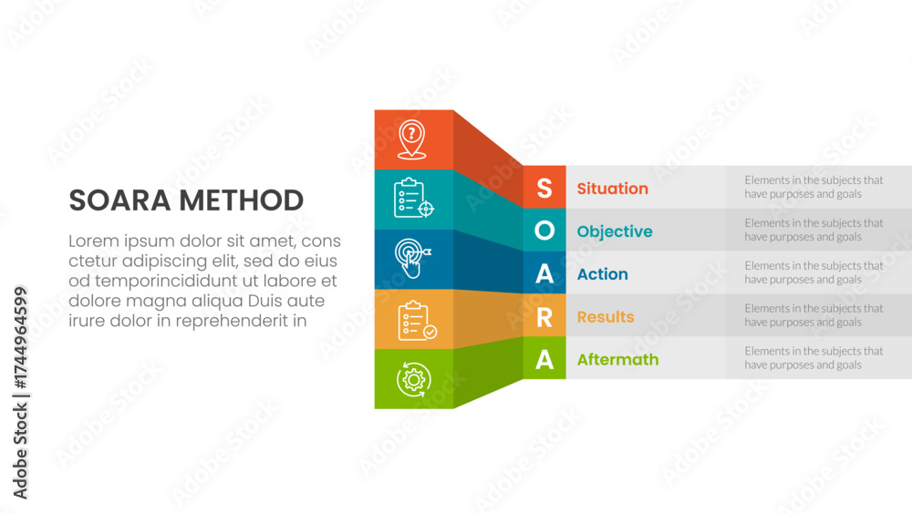 SOARA interviewing method infographic template banner with creative box table shadow 3d style with 5 point list information for slide presentation #1744964599