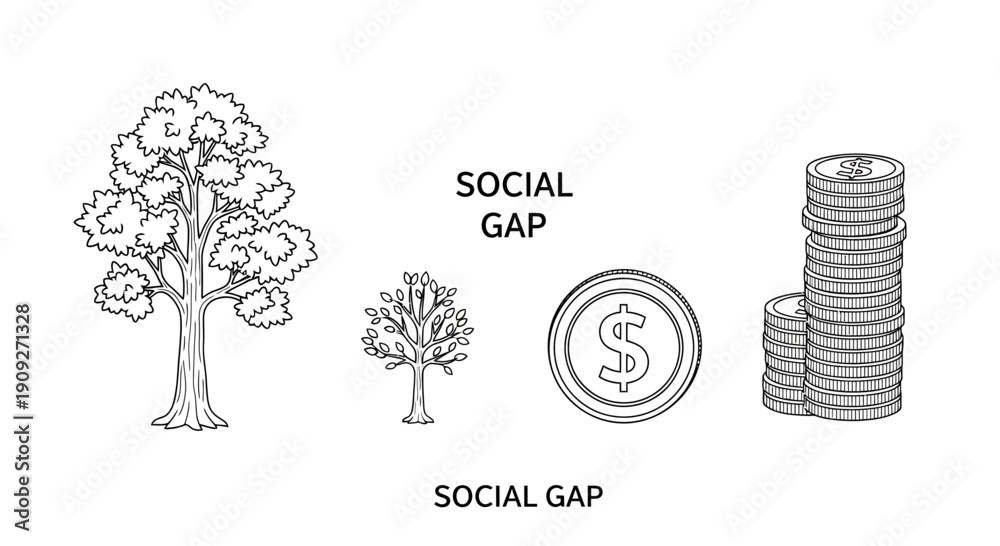 Social Gap Inequality: Big Tree vs Small Tree, Coin, Stack of Coins #1909271328