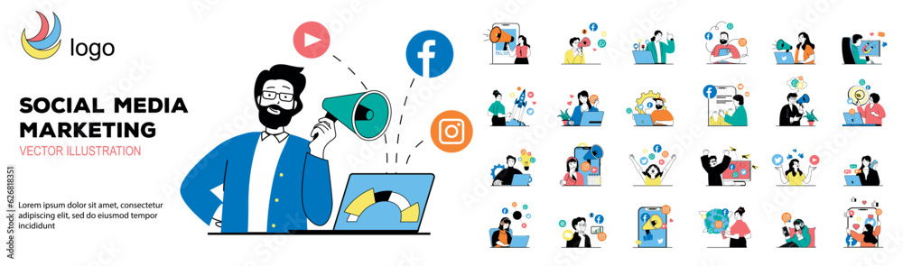 Social media marketing concept with character situations mega set. Bundle of scenes people analyzing trends, creating promotion strategy and advertising online. Vector illustrations in flat web design #626818351