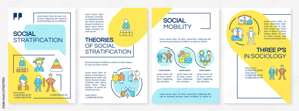 Social stratification blue and yellow brochure template. Leaflet design with linear icons. Editable 4 vector layouts for presentation, annual reports. Questrial, Lato-Regular fonts used #756279124