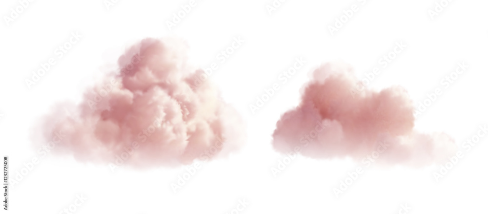 Soft and Fluffy Pink Clouds Isolated on a White Background. A pair of light pink clouds floating serenely against a pure white background, tranquil atmosphere. Vector illustration #1232725008