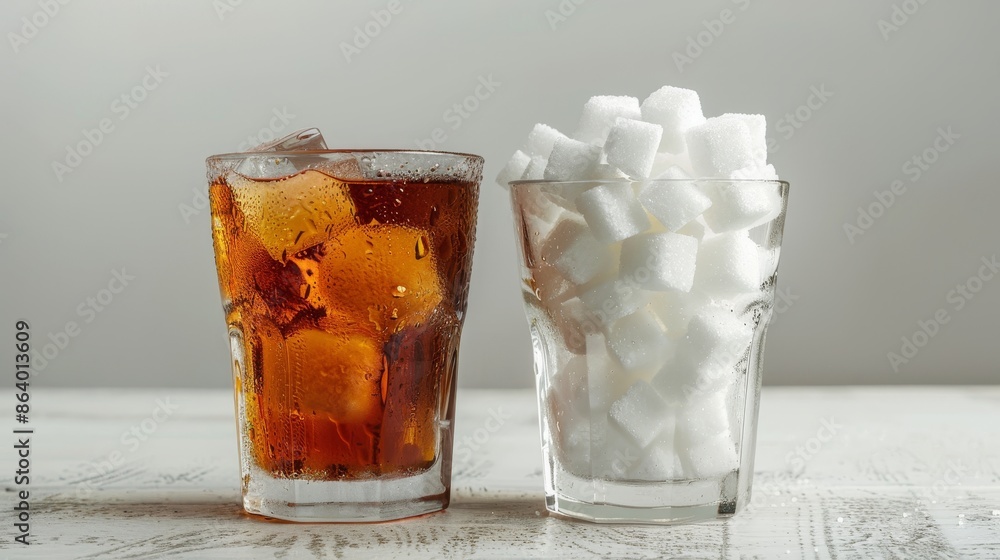 Soft drink in a glass with a mound of sugar cubes next to it, representing the sugar amount, creating a visual health comparison #864013609