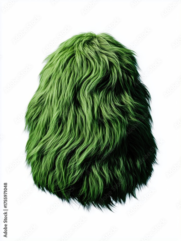 Soft fluffy organic shape covered in dense green fur with long natural strands and subtle highlights, isolated on white background, macro 3D render. #1755971048