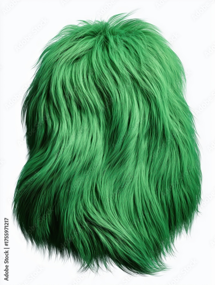 Soft fluffy organic shape covered in dense green fur with long natural strands and subtle highlights, isolated on white background, macro 3D render. #1755971217