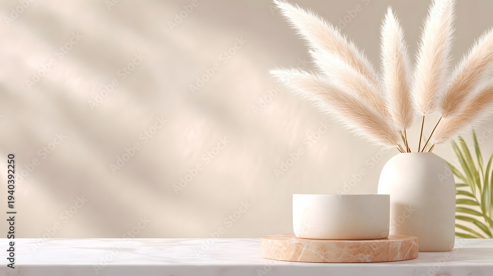 Soft light and shadows enhance a minimalist interior vignette with a cream vase of pampas grass and a decorative stone podium on a marble surface #1940392250