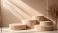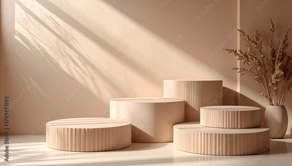 Soft light photo of podiums arranged with vase and dried plants symbolizing harmony balance and eco inspired minimalist interior design trend for modern living #1709681192