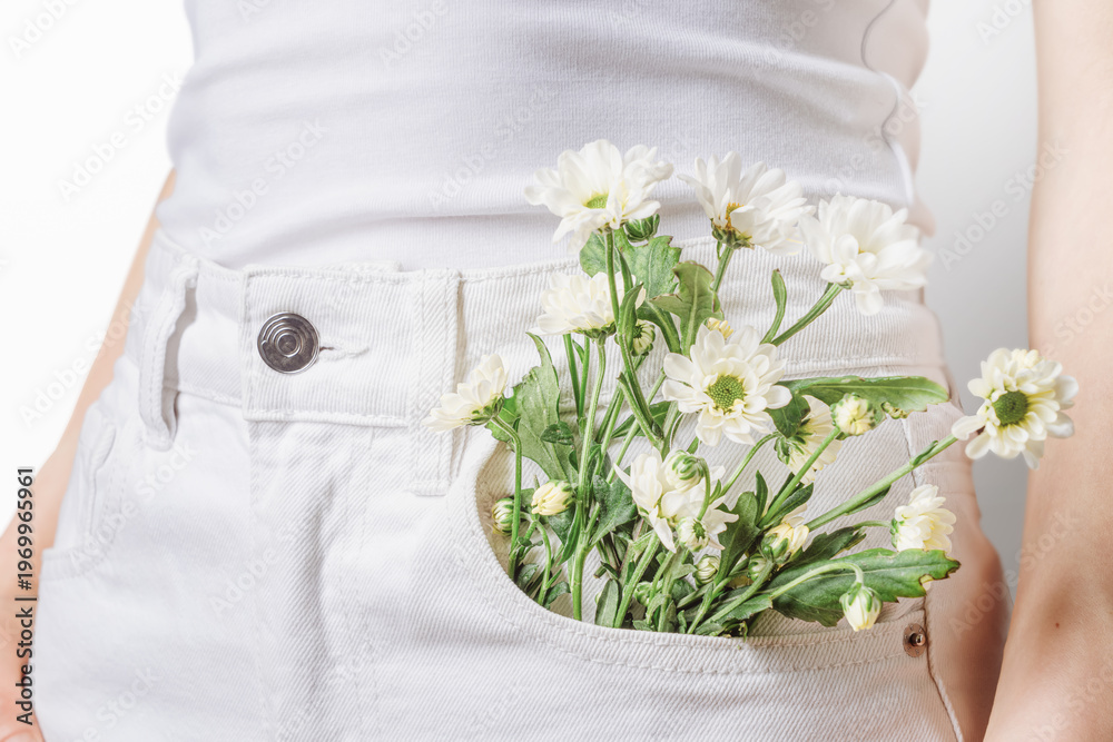 Soft minimalism concept with white daisies in front pocket, clean aesthetic, light tones, skincare and wellness style, calm modern lifestyle #1969965961