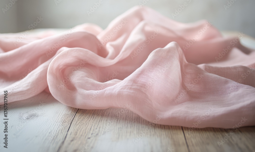 Soft pink linen fabric draped over a wooden table, delicate textures and natural folds creating a calming atmosphere #1767017965