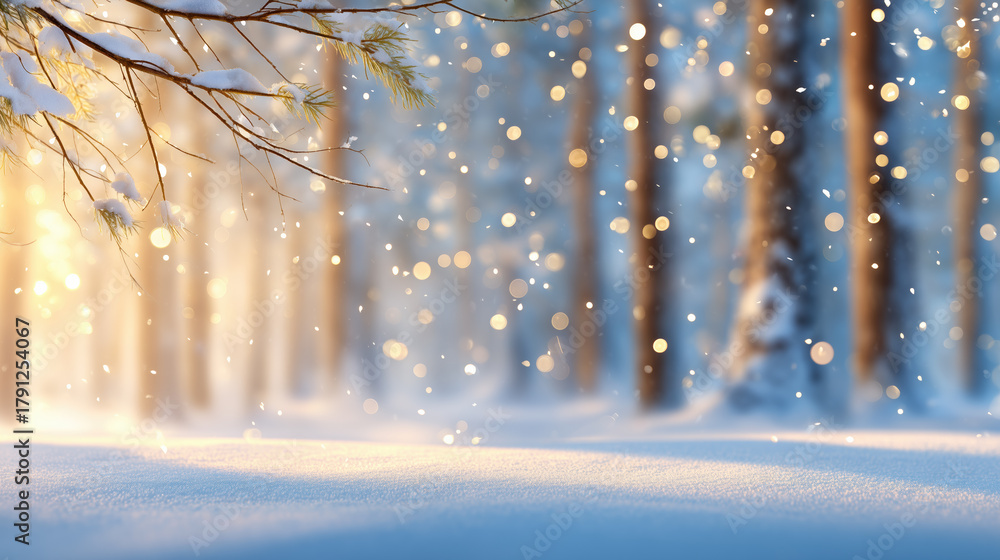 Soft snowflakes fall in a tranquil forest as sunlight filters through tall trees. The ground is covered in a thick blanket of snow, creating a peaceful winter atmosphere #1791254067