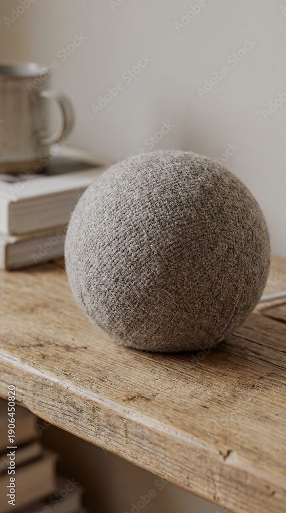 Soft woolen ball on wooden surface in cozy interior #1906450820