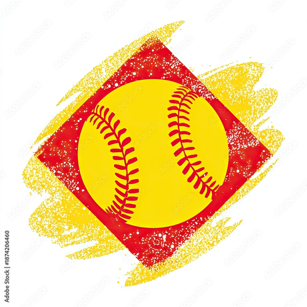 Softball Sport Logo Yellow ball with red stitches pitchers windup diamond dust cloud nostalgic summer nights isolated on white background #1874206460