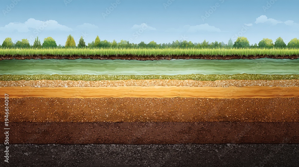 Soil profile slice showing topsoil subsoil and sediment layers #1946614007