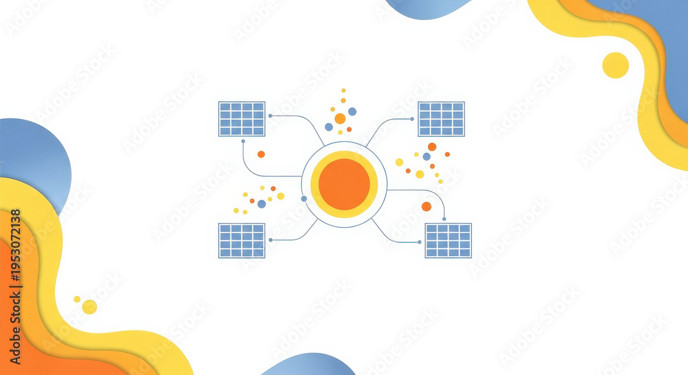 Solar energy concept, minimal conceptual illustration with a central circular sun connected by thin curved lines to simple solar #1953072138