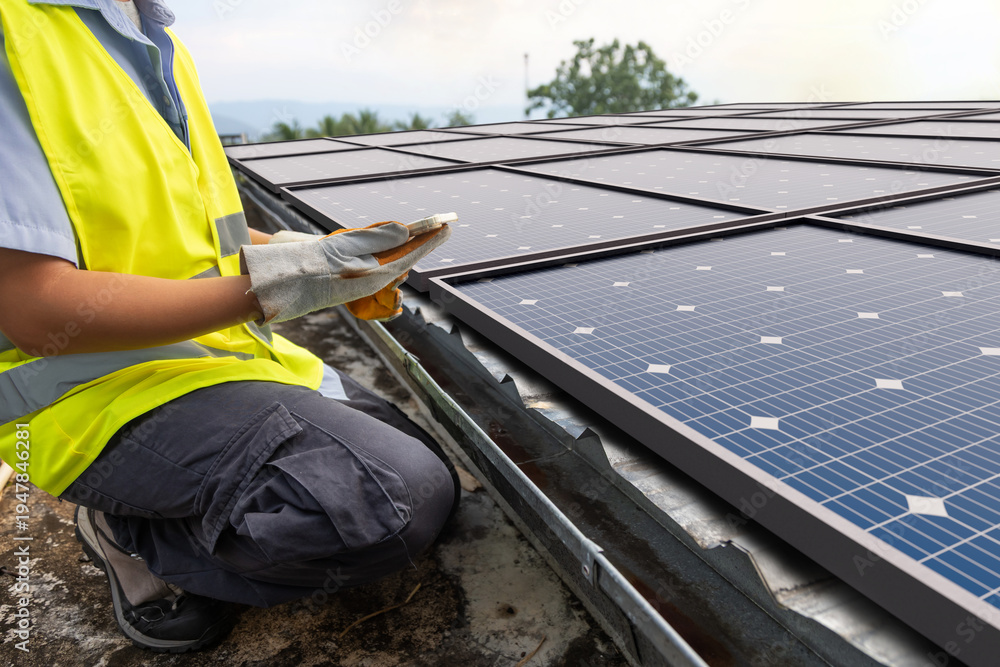 Solar energy technician monitoring photovoltaic system on rooftop with mobile device #1947846281