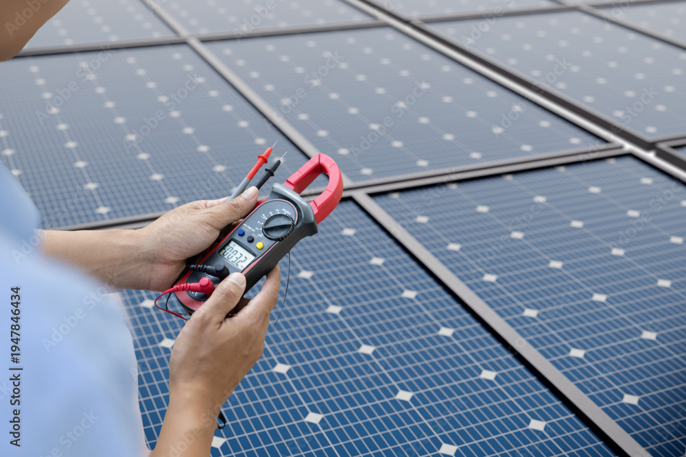 Solar energy technician testing photovoltaic system with multimeter for electrical maintenance #1947846434