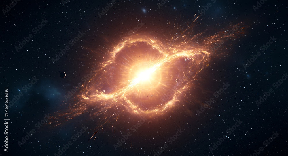 Solar Flare Space Warp Effect An abstract background showing a bright solar flare warp effect, with orange-yellow plasma arcs bending and distorting space against a dark starry backdrop #1454536161
