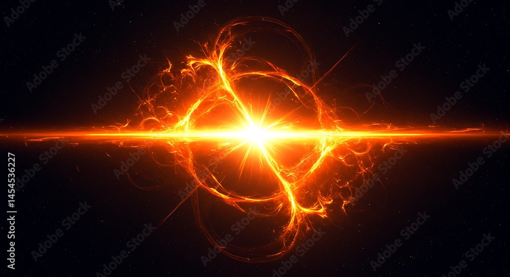 Solar Flare Space Warp Effect An abstract background showing a bright solar flare warp effect, with orange-yellow plasma arcs bending and distorting space against a dark starry backdrop #1454536227