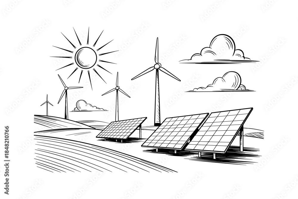 Solar panels silhouette vector illustration design, Black silhouette of wind turbines and solar panels on white background, Solar powered street light silhouettes, Renewable energy source concept #1848210766