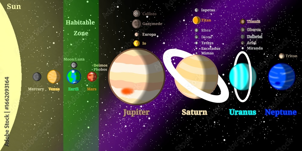 Solar System Infographic with Names of Planets, Major Moons, and Habitable Zone – Scientific Infographic #1662093164