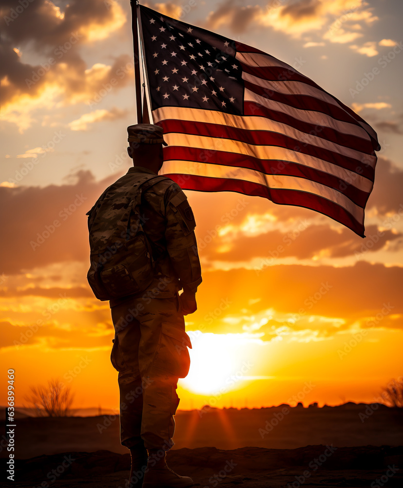 Soldier and USA flag on sunrise background . Veterans Day. #636899460