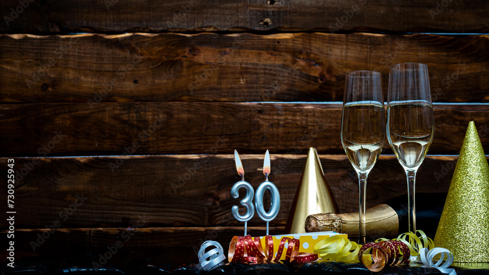 Solemn background for the anniversary with the number 30. Happy birthday background on brown wooden background with champagne bottle and champagne glasses. Beautiful holiday decorations copy space. #730925943