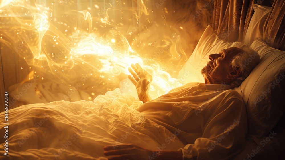 Solemn Transition: Soul Ascending in Radiant Light Beside Grieving Loved One #805527220