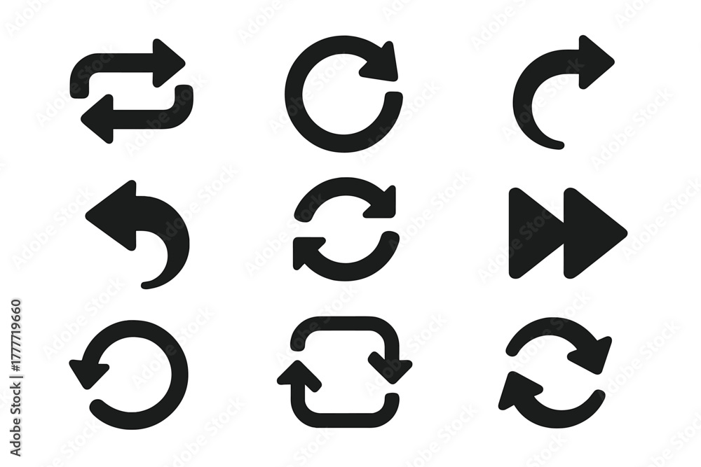 Solid Style Icons. Solid style icons of Repeat and retry: repeat symbol, replay button, retry arrow, redo icon, rotate arrow, #1777719660