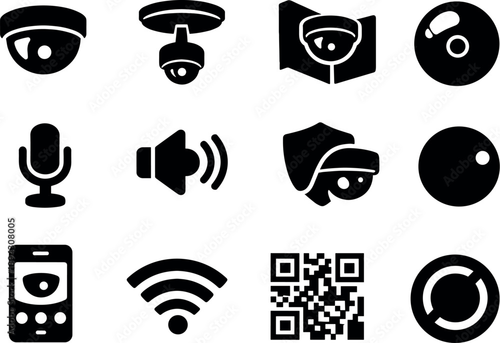 Solid vector icons of indoor surveillance: dome camera, ceiling mount, corner mount, wide angle lens, microphone #1894308005