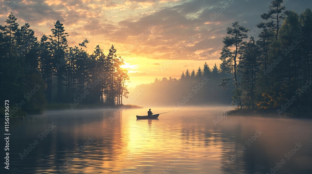 Solitary fisherman in a calm lake at sunrise, surrounded by misty forest. #1156193673