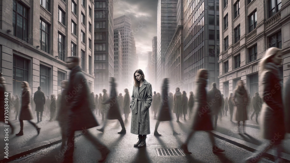 Solitary woman standing perfectly still in sharp focus on a busy city street while a crowd of blurred people rushes past her in motion representing isolation. Alone in a fast-paced world. #1970534947