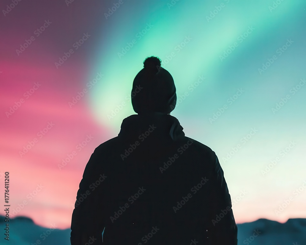 Solo hiker standing on cliff under glowing aurora sky, sense of wonder #1776411200