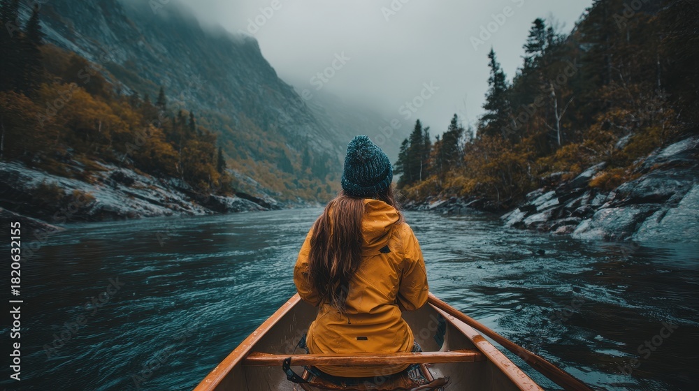 Solo paddler navigating a serene river through a misty mountain landscape. #1820632155