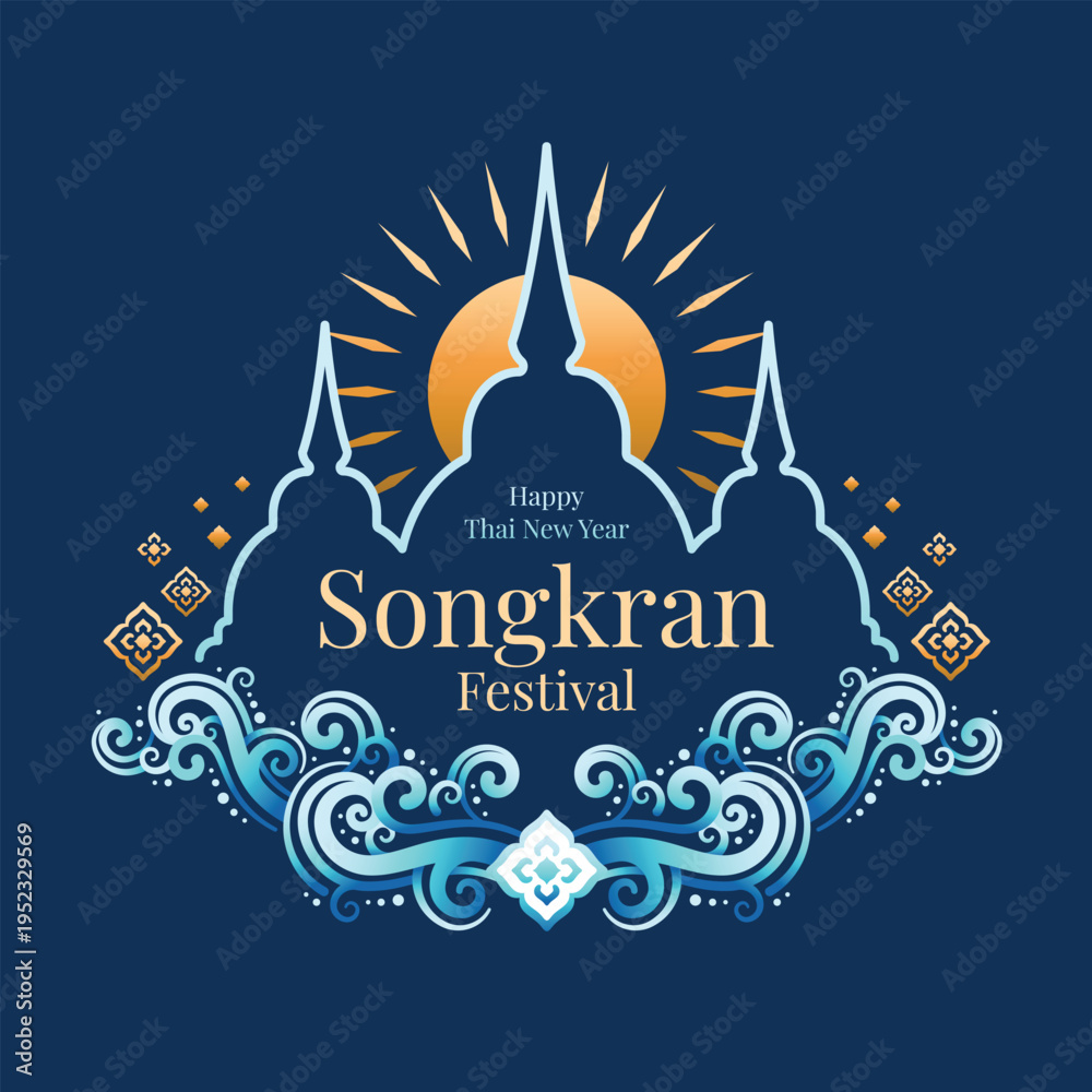 Song kran festival, Happy thai new year - Text in pagoda with sunlight and water curve wave spraying on dark blue background vector design #1952329569