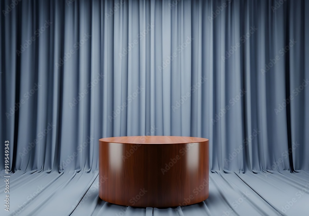 Sophisticated brown podium against the backdrop of elegant grey drapery #1919549343