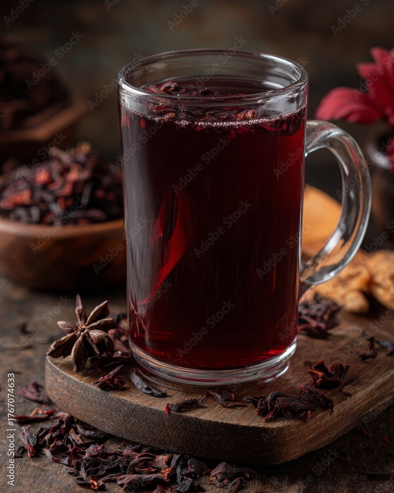 Sorrel (Zobo) drink in glass, deep red hue, hibiscus petals with ginger and clove, floral and tart. #1767074633