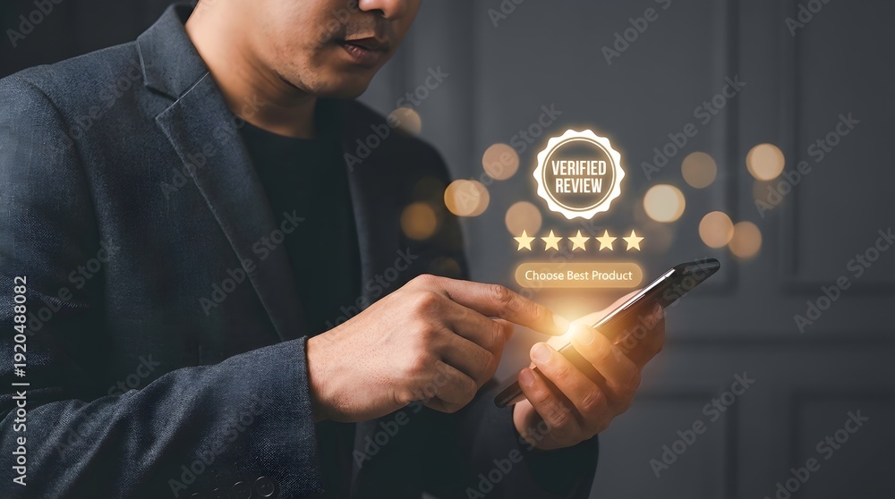 Southeast Asian businessman in tailored blazer engages with smartphone, focusing on rating stars in office satisfaction survey interaction, high-quality photography #1920488082