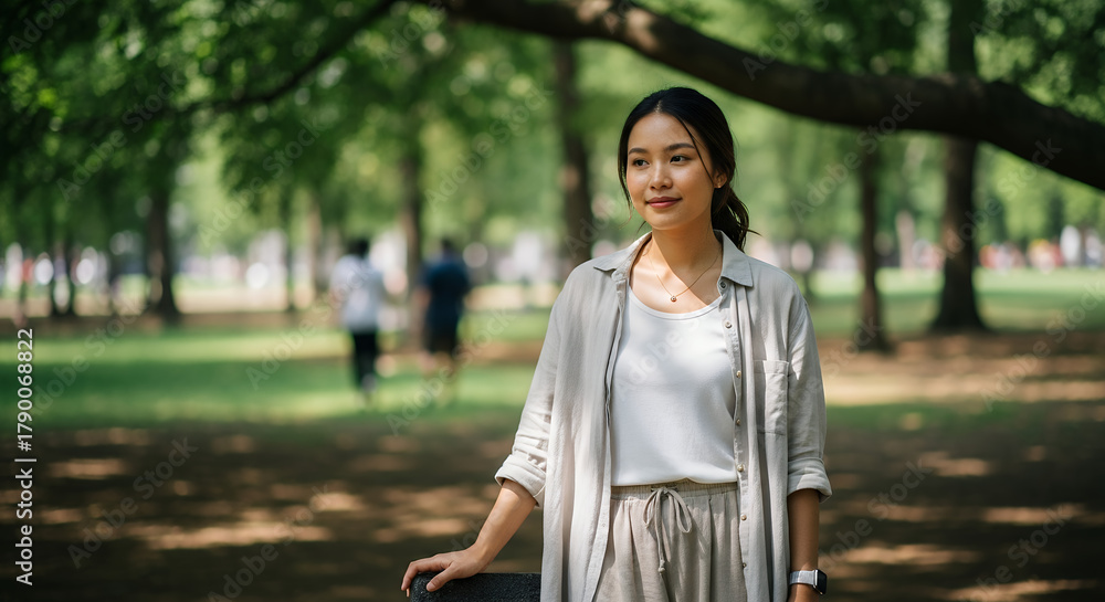 Southeast Asian woman with dewy natural skin and subtle makeup wearing light casual clothing, standing in an outdoor park under diffused daylight, captured in a relaxed natural pose and calm atmospher #1790068822