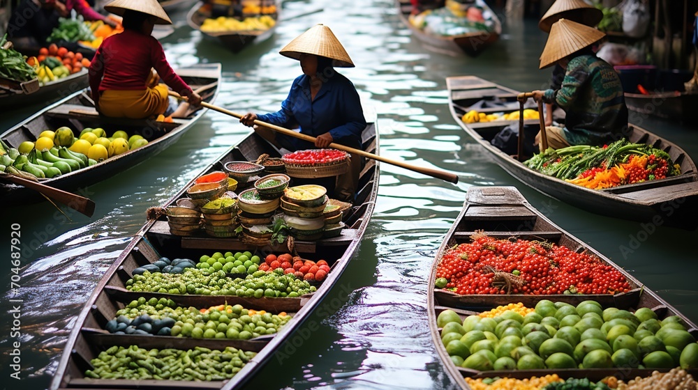 Southeast Asian women selling fruits and vegetables in a floating market #704687920