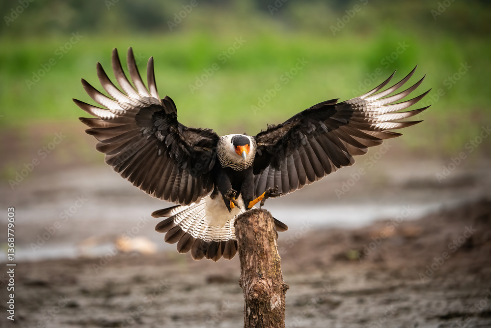 Southern Crested Caracara (Caracara plancus). Falcon family landing with spread wings. Wetland edge with blurred background. Powerful pose and sharp symmetry create a commanding visual. #1368779603