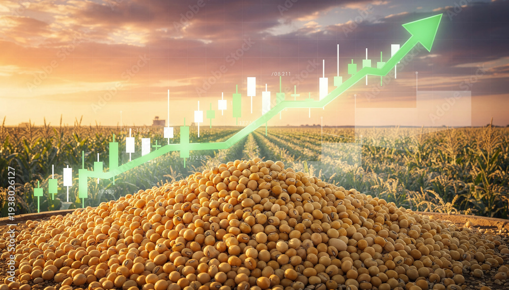 Soybeans pile and field with rising stock chart at sunset, agriculture economy #1938026127