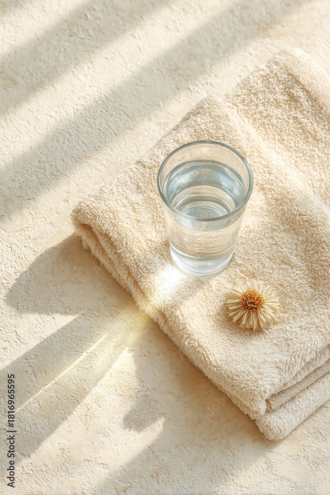 Spa-style scene with glass of water on towel and natural flower #1816965595