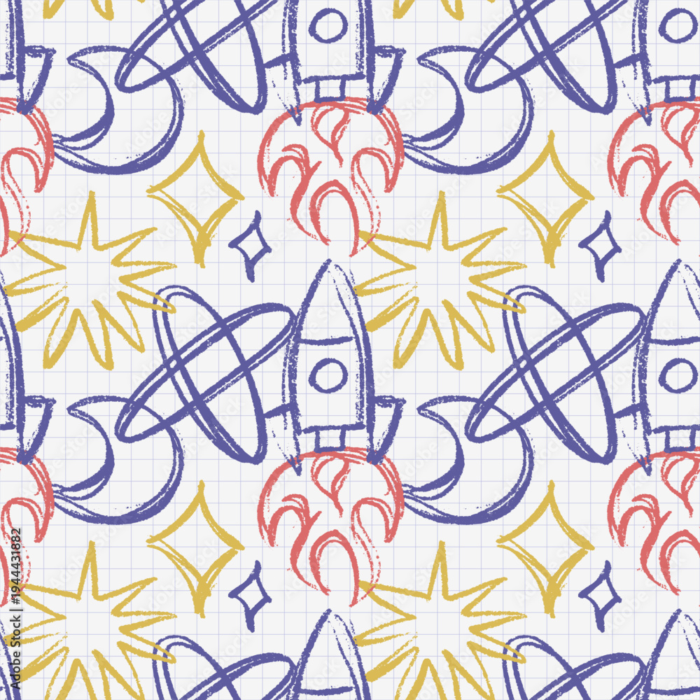 Space seamless pattern on grid paper. Hand drawn rough pencil sketch with rocket, planet, star and moon. Messy doodle scribble background texture for kids wallpaper, school notebook and wrapping. #1944431882