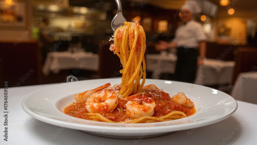 Spaghetti with shrimp in a rich tomato sauce, gourmet seafood pasta dish, chef's special meal #1764689588