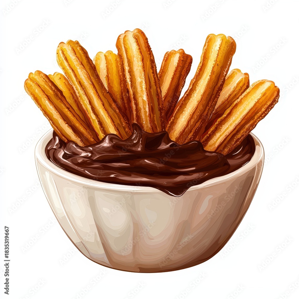 Spanish food churros con chocolate national cuisine dish isolated on white background, colorful cartoon illustration #1835319667