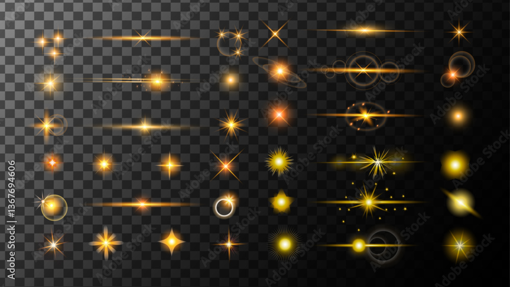Spark spot light special effect design. Realistic flares. Glowing effects light or sunlight reflection from lens. Stars in space. Isolated glints set. Sparkle glares.Vector shimmering elements #1367694606