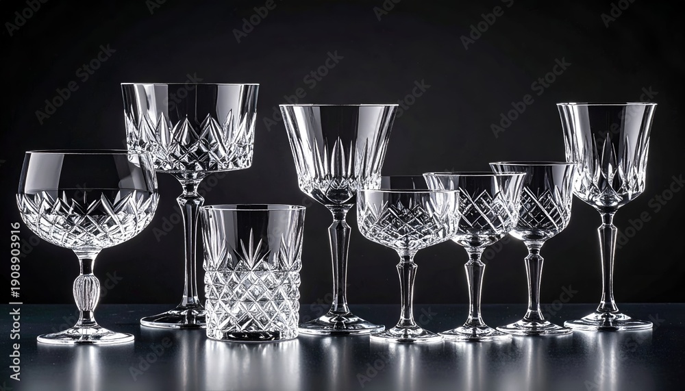 Sparkling crystal glassware collection on dark, reflective surface #1908903916