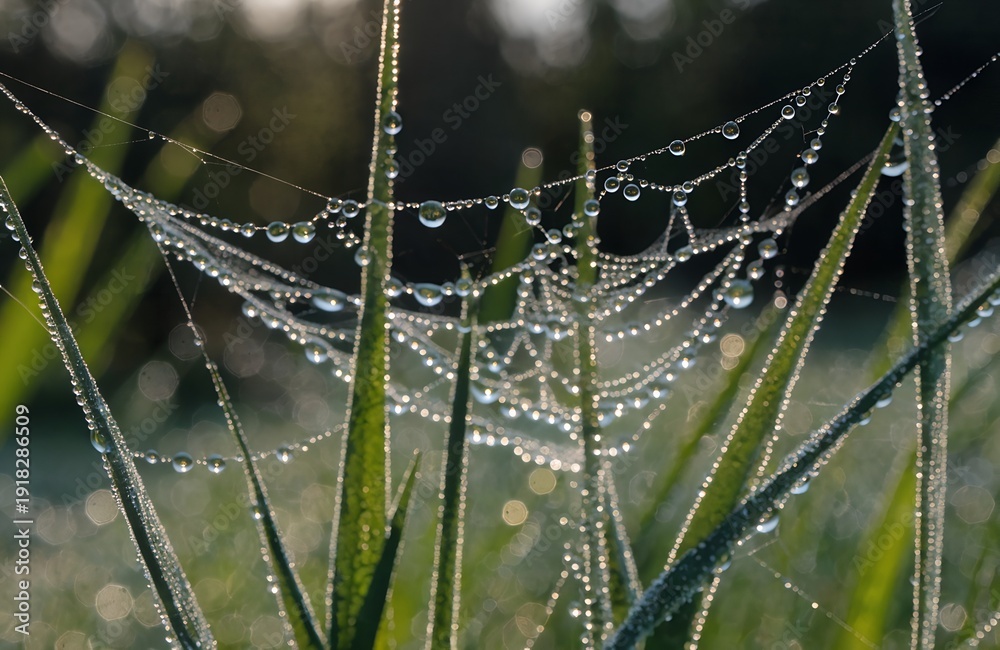 Sparkling dew drops on spider web in morning sunlight. #1918286509